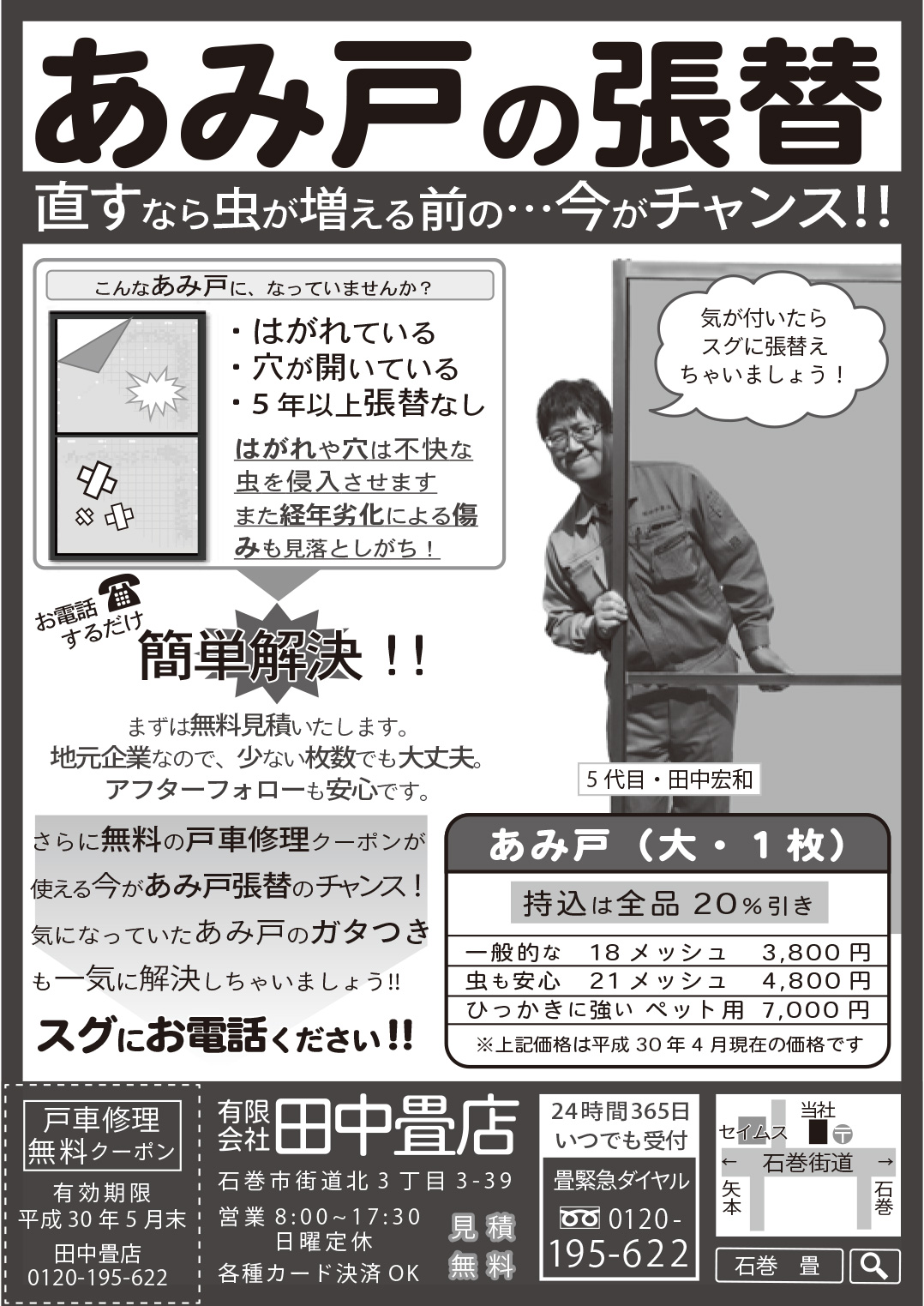 網戸の張替なら今がチャンス!!こんにちは、中の人です! さて、春真っただ中ですがこれから夏に向けて網戸の準備はお済みでしょうか? 田中畳店では無料見積もり、今ならさらに戸車修理クーポン使えます!!
